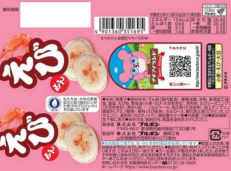 Thành phần chính: tinh bột khoai tây (hoặc tinh bột làm snack), dầu thực vật, bột gạo, bột tôm, muối, dầu gia vị chứa bột mì/tôm/đậu nành, rong biển/tảo biển, bột tôm nêm, chất nhũ hóa (lecithin), chất ổn định, chất chống oxy hóa, hương vị tôm tổng hợp, màu thực phẩm…