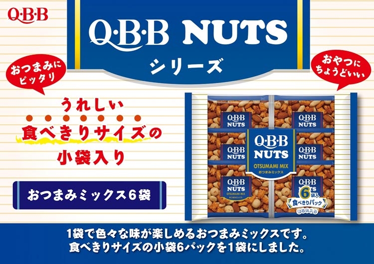 Sản phẩm là hỗn hợp snack mặn “QBB おつまみミックス” do công ty Rokko Butter (六甲バター) sản xuất — một thương hiệu nổi tiếng Nhật Bản chuyên về các loại hạt, snack và phô mai. Hộp bao gồm 6 gói nhỏ (6 小袋) để người dùng dễ chia sẻ hoặc dùng từng phần.