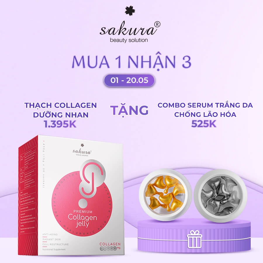 MUA 1 ĐƯỢC 3: Tặng Combo Serum dưỡng trắng da CoQ10 và Serum phục hồi DNA trẻ hóa da trị giá 525K khi mua 01 hộp Sakura Premium Collagen Jelly.