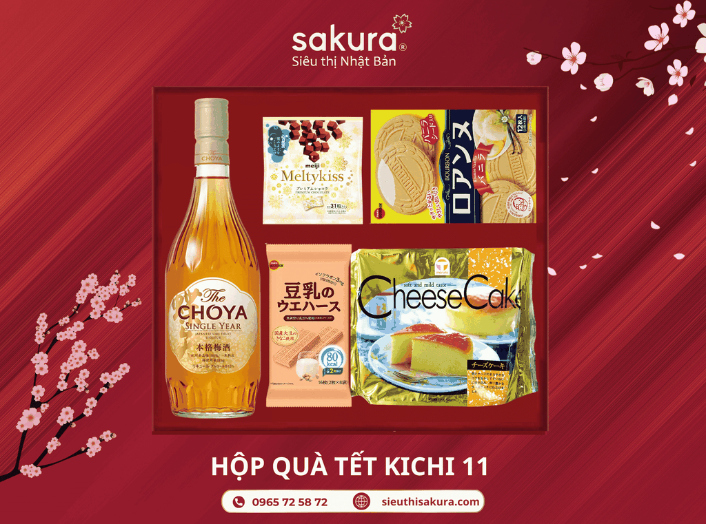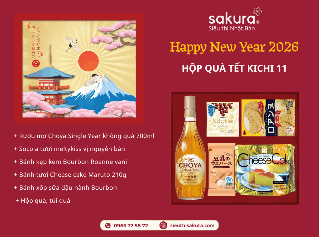 - Lấy cảm hứng từ “Kichi” – điều lành, Hộp quà Tết Nhật Bản 2026 – KICHI 11 gửi lời chúc cát tường và phú quý đầu xuân. Tâm điểm là rượu mơ Choya Single Year 700 ml không quả, ủ một năm cho vị êm – cân bằng; hòa cùng socola tươi Meltykiss vị nguyên bản đậm cacao; bánh kẹp kem Bourbon Roanne vani giòn – nhẹ – thơm; bánh tươi Cheese cake Maruto 210 g mềm mịn; và bánh xốp sữa đậu nành Bourbon bùi béo. Set quà hài hòa hương – vị – dinh dưỡng, dễ chia sẻ đãi khách.
