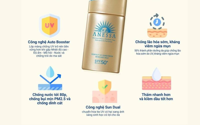 Nhìn chung, kem chống nắng Anessa có kết cấu mỏng nhẹ, không gây bết dính hoặc bí da. Sản phẩm dễ dàng thẩm thấu vào da và không để lại vệt trắng hay làm thay đổi tone da. Một số dòng kem chống nắng Anessa còn có khả năng chống nước, mồ hôi và chống trôi, cung cấp sự bảo vệ kéo dài, đặc biệt hữu ích cho các hoạt động ngoài trời hoặc khi đi biển.