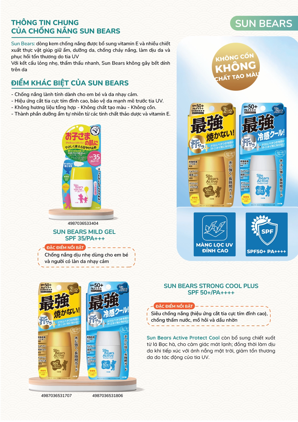 Chống nắng phổ rộng, kháng nước nhẹ.