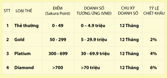 Với mỗi lần mua hàng tại Siêu thị SAKURA (SAKURA Store), quý khách sẽ được tích điểm và được áp dụng các chính sách chiết khấu theo quy định sau: