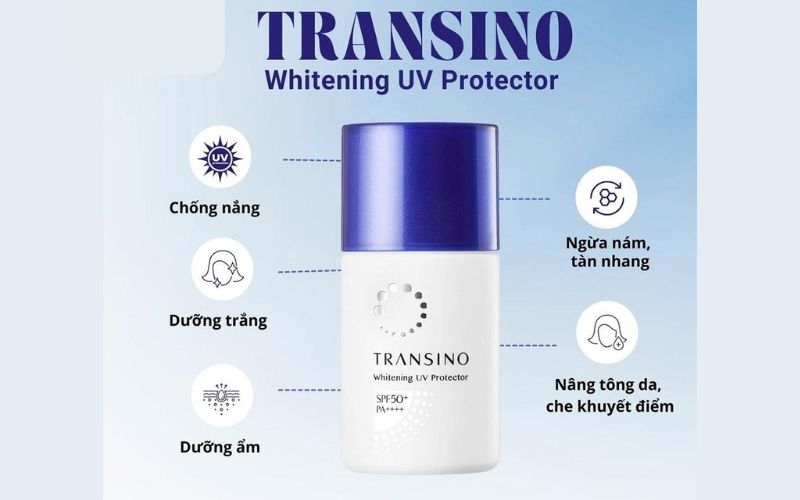 Kem chống nắng Transino làm trắng da có chỉ số chống nắng SPF50+ và PA++++, là một trong những chỉ số chống nắng tốt nhất được các chuyên gia da liễu khuyên dùng để bảo vệ da khỏi tác động của tia UV, đặc biệt là hàng ngày.