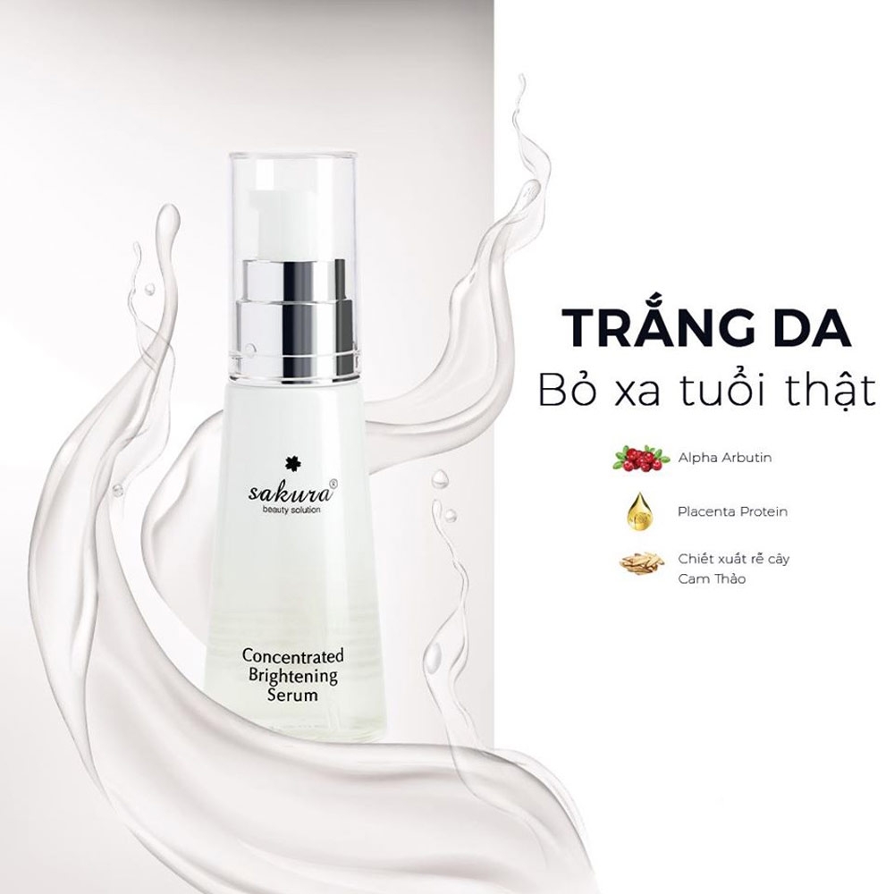 Serum dưỡng trắng da Sakura Concentrated Brightening Serum có vẻ là một sản phẩm chăm sóc da cao cấp với nhiều thành phần dưỡng chất, đặc biệt là Alpha Arbutin, được kết hợp với công nghệ tiên tiến của Nhật Bản.