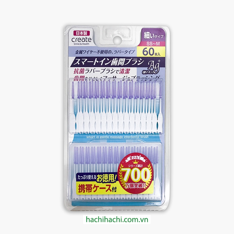 Tăm silicon mềm kháng khuẩn CREATE Ag+ xỉa kẽ răng 60 chiếc size SS-M - Hàng Nhật nội địa