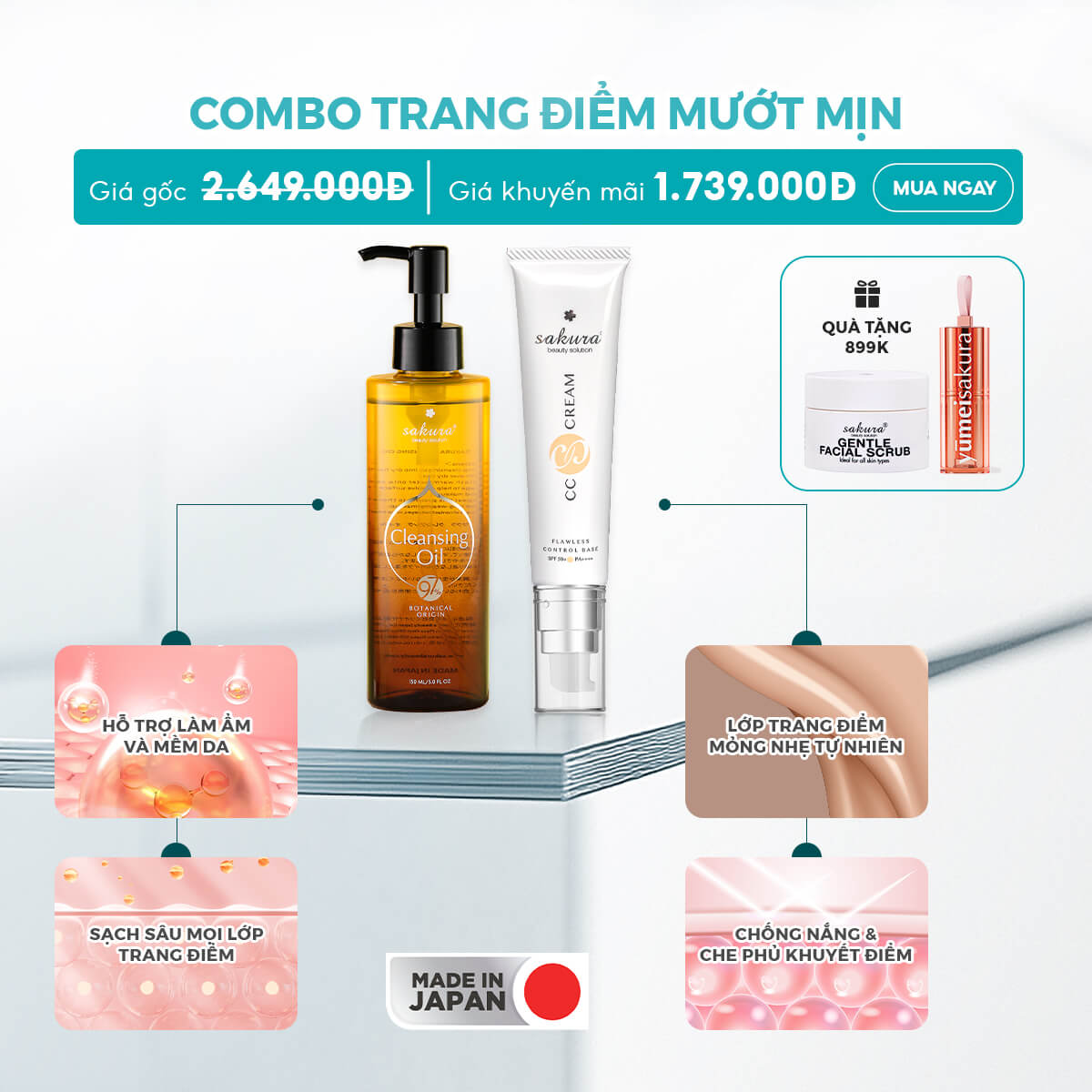 Đó là điều mà Combo Dầu tẩy trang Sakura Cleansing Oil và Kem nền CC Cream Sakura mang đến cho làn da bạn.