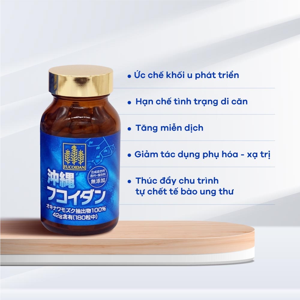 Sản phẩm chứa chất Fucoidan từ tảo biển nâu, đã được chứng minh có khả năng ức chế sự phát triển của tế bào ung thư. Chất này cũng kích thích quá trình tự diệt tế bào ung thư, giúp ngăn chặn quá trình lấy chất dinh dưỡng của tế bào ung thư và hạn chế sự lan rộng của chúng ra các cơ quan khác trên cơ thể.