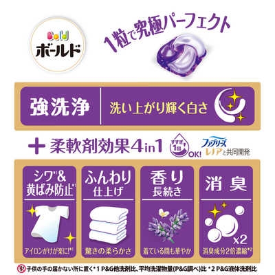 Viên giặt Bold Gel Ball 4D hương oải hương & hoa nhài – refill 27 viên là giải pháp giặt giũ đa năng đến từ thương hiệu P&G Nhật Bản, được thiết kế dạng gel ball tiện lợi giúp bạn làm sạch quần áo tất cả trong một bước. Sản phẩm có 27 viên gel giặt với công nghệ 4D nâng cao, kết hợp khả năng giặt sạch, khử mùi, làm mềm vải, lưu hương thơm lâu và chống nếp nhăn, mang đến trải nghiệm giặt giũ hiệu quả hơn so với bột giặt truyền thống. Thiết kế dạng tái chế (refill) giúp tiết kiệm không gian và giảm rác thải nhựa. Viên giặt tan hoàn toàn trong nước, phù hợp với cả máy giặt cửa trên và cửa trước.